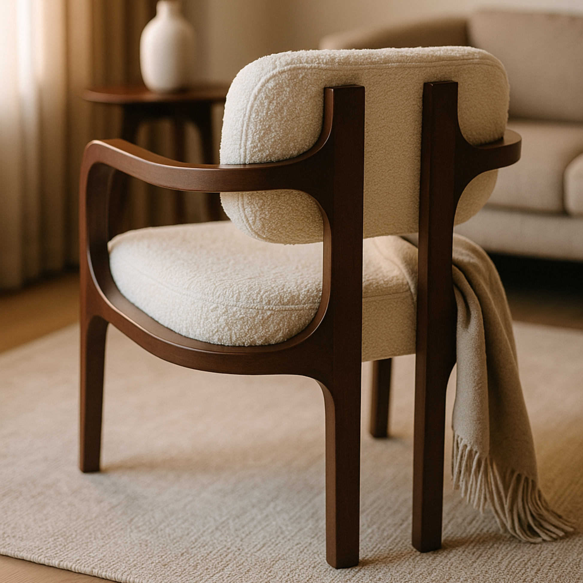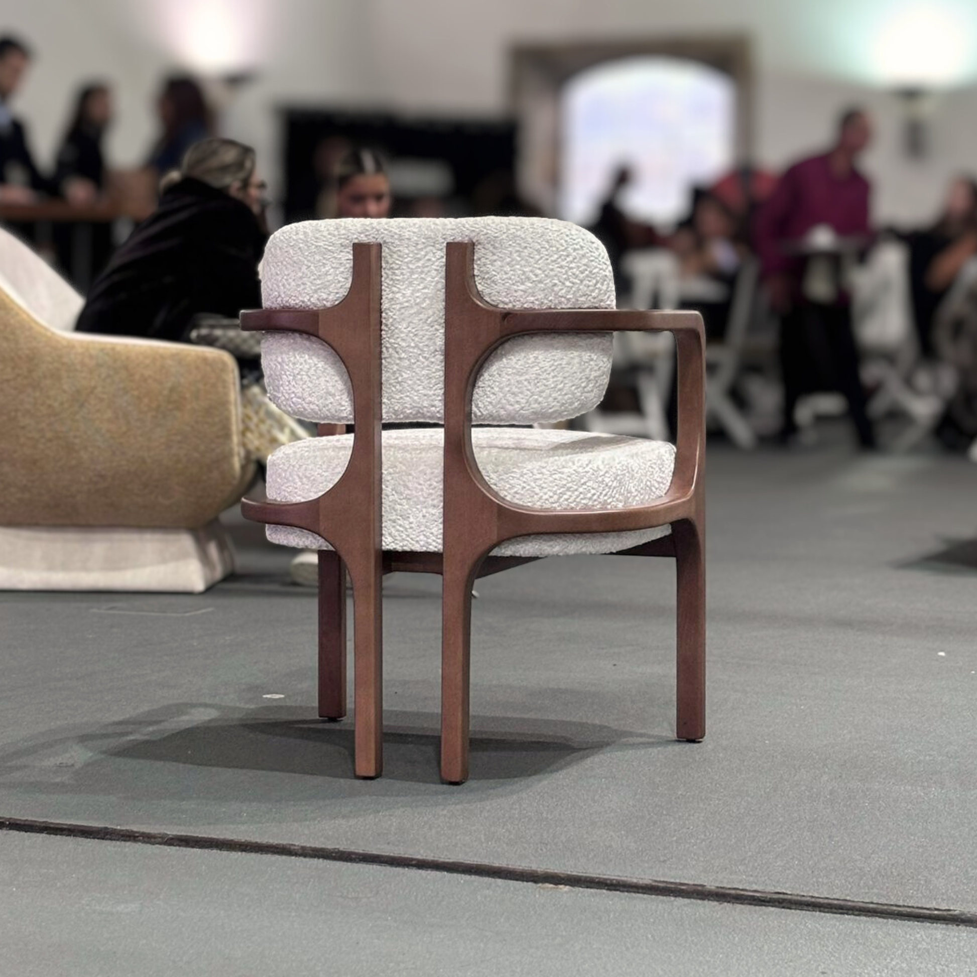 The contrast between the smooth upholstery and the intricate wooden work creates a striking and elegant silhouette, making this chair a statement piece from every angle. Designed to complement both contemporary and classic interiors, the BELL chair brings warmth, character, and elevated style to any dining room, living space, or reading nook.