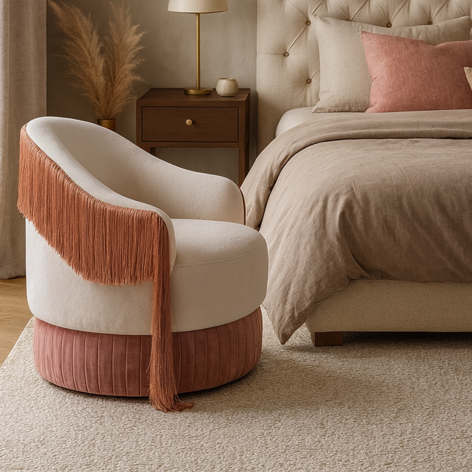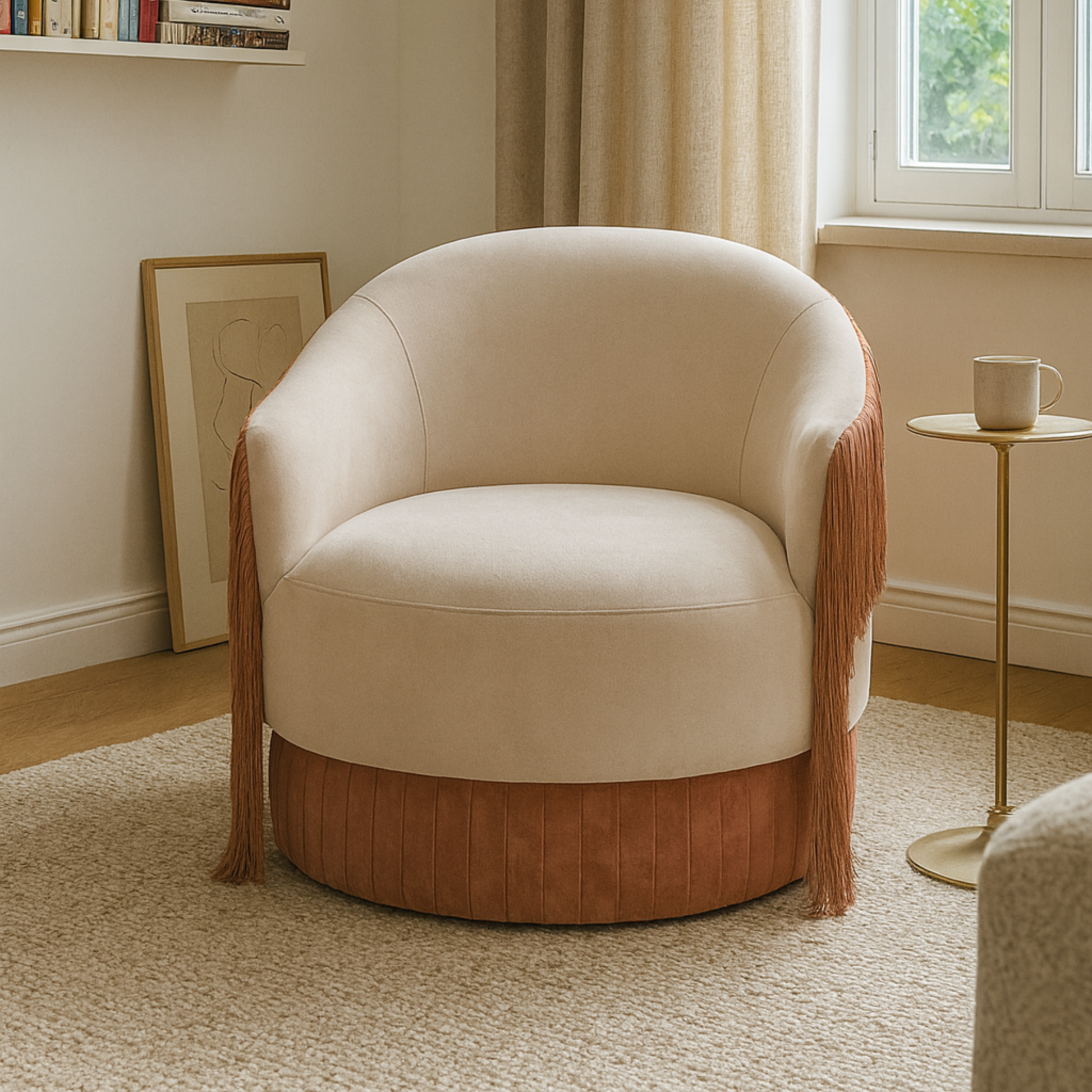 Introducing the Rosita swivel armchair, a captivating piece that blends elegance, movement, and luxurious texture. Wrapped in sumptuous velvet, Rosita invites comfort at every touch, while its distinctive back fringe adds a playful yet refined sense of motion — gently swaying as the chair rotates.
